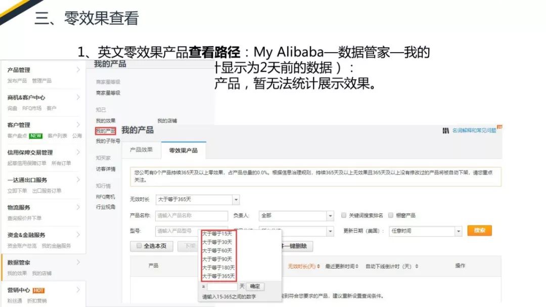 查看路徑教大家一下,My Alibaba界面,點(diǎn)擊數(shù)據(jù)管家,進(jìn)入到我的產(chǎn)品這樣一個界面。在我的產(chǎn)品這個界面里面是分為兩塊的。第一塊產(chǎn)品的效果,第二塊零效果產(chǎn)品。點(diǎn)擊第二塊零效果產(chǎn)品,就可以看到平臺的零效果產(chǎn)品。 統(tǒng)計(jì)的數(shù)據(jù)顯示為兩天前的數(shù)據(jù),官方在設(shè)置工具的時(shí)候,將零效果的實(shí)現(xiàn)進(jìn)行了一個分段。分別有365天以上的,180以上的,90天以上的,60天以上的,30天以上的,15天以上的。并且你可以不使用人工進(jìn)行輸入。第二個,多元市場的零效果產(chǎn)品暫時(shí)是沒法被統(tǒng)計(jì)到的。如果你發(fā)布了大量的多元產(chǎn)品并且效果不好,我的建議可以直接刪除,再重新進(jìn)行發(fā)布。