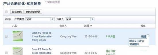 優(yōu)化思路:在產(chǎn)品診斷優(yōu)化中找到重復(fù)鋪貨的產(chǎn)品,如下圖,可以直接刪除產(chǎn)品,或者點(diǎn)擊編輯,進(jìn)入產(chǎn)品的編輯頁(yè),對(duì)產(chǎn)品標(biāo)題、關(guān)鍵詞重新修改優(yōu)化即可。
