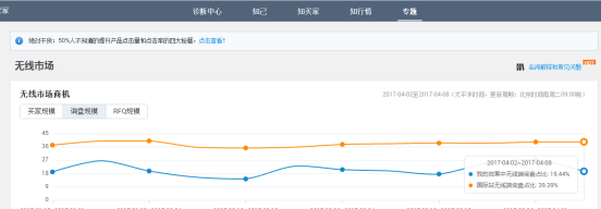 我們以“詢盤(pán)規(guī)?!睘槔?,看一下藍(lán)色曲線是“我的效果中無(wú)線端詢盤(pán)占比”和橙色曲線“國(guó)際站無(wú)線端詢盤(pán)占比”,如圖,橙色數(shù)字是39.39%,表示整個(gè)國(guó)際站無(wú)線端詢盤(pán)占了近4成,藍(lán)色19.44%,說(shuō)明自己的無(wú)線端詢盤(pán)占比只有不到2成。也就是說(shuō),藍(lán)色曲線在橙色線的下面,也就是說(shuō)明“你無(wú)線端詢盤(pán)流量”不如“行業(yè)平均值”。