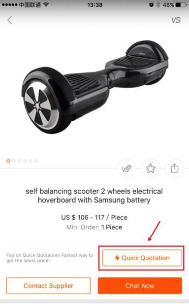 閃電報(bào)價(jià)報(bào)名成功后,您在無(wú)線買家APP端(Alibaba.com App)的產(chǎn)品詳情頁(yè)面上會(huì)新增“閃電報(bào)價(jià)”入口,如下圖: