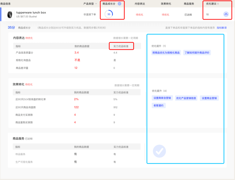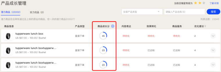 在“My Alibaba-產品管理-產品成長管理”中,系統已根據影響商品成長分的各項數據指標,為店鋪內每款商品提供了若干條與之相應的優(yōu)化建議(如下圖所示),點開右側下拉箭頭,將呈現系統對于該商品的具體優(yōu)化建議項,完成相關優(yōu)化將有助于商品成長分的提升。