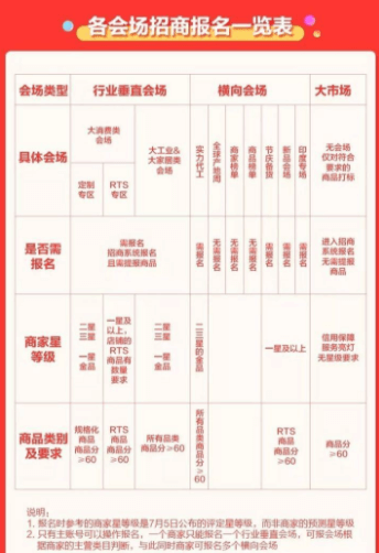 c.服務中1星商家升級金品:針對7月5日評定星等級一星商家,在報名時是簽單且到款狀態(tài)(不看認證只看到款),可以選擇合適的會場報名(系統(tǒng)時間T-2,即最晚需要在7.31到款)