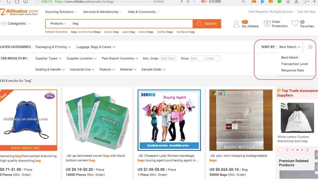 我們來看下這個截圖,假設(shè)現(xiàn)在我們要買包,我輸入一個bag,然后看一下我們的右側(cè),有一個叫做sort by ,點擊之后會有三個選項: