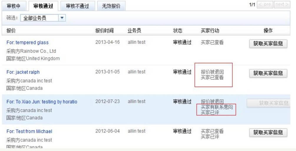 所以說至少要打敗同行的80%,另外就是到我們的RFQ的這個報價管理去查閱,如果說我們在查閱買家行動,大部分你的這些RFQ都是買家已退回,或者買家沒查看。