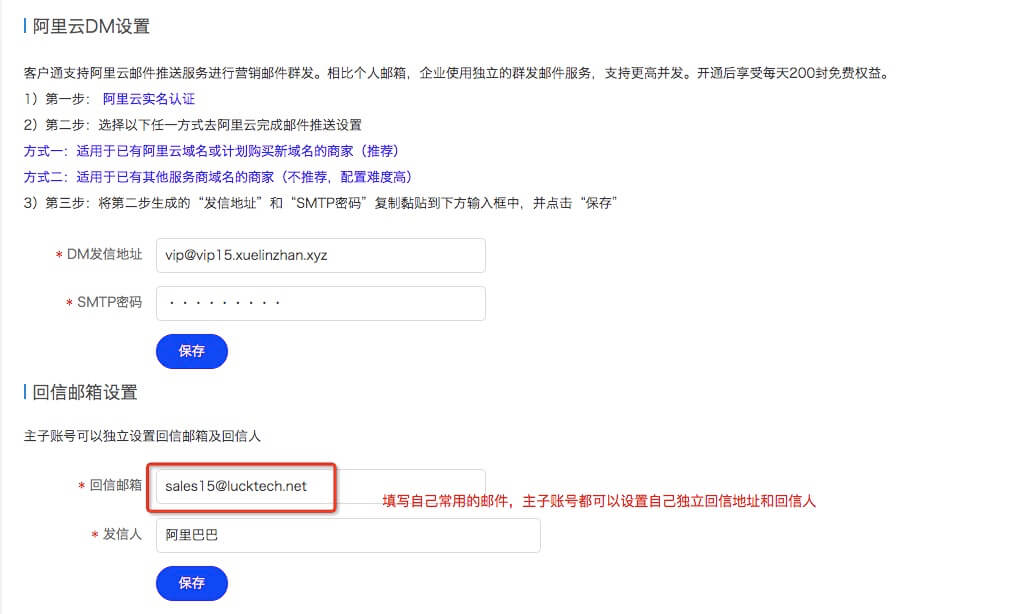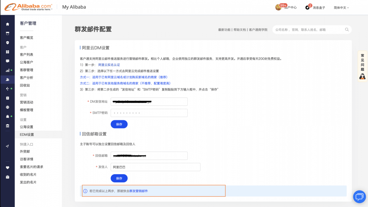 4.回到My Alibaba-客戶管理-edm配置,把發(fā)信地址和密碼粘貼進(jìn)去,并立即保存。不保存無法配置回信郵箱