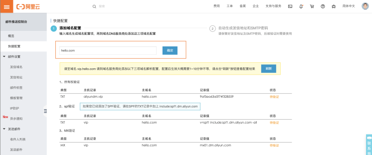 然后系統(tǒng)會自動執(zhí)行二級域名設(shè)置,DNS解析,發(fā)信地址設(shè)置,SMTP密碼設(shè)置;與原配置流程相比減少4步(二級域名設(shè)置、DNS解析、發(fā)信地址設(shè)置、SMTP密碼設(shè)置)