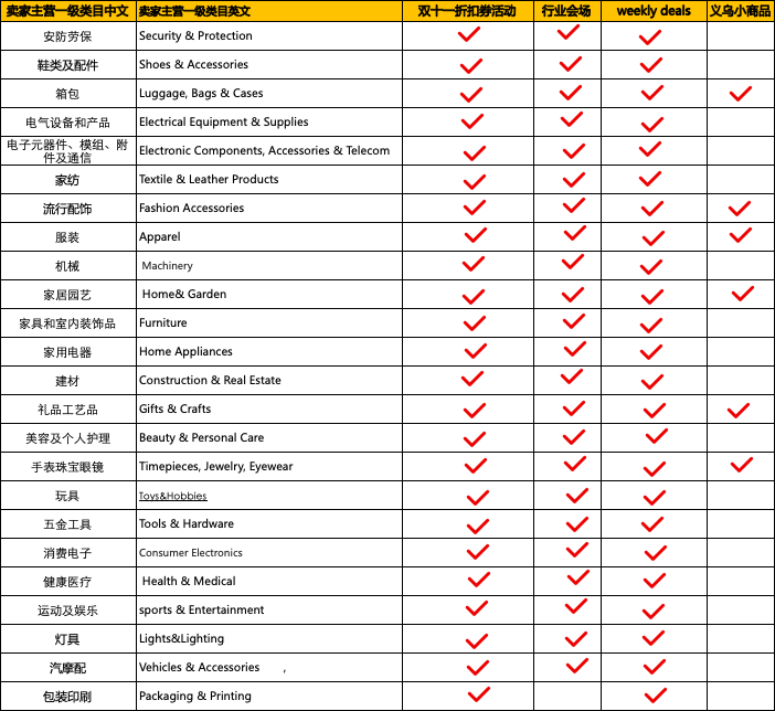 注:行業(yè)會(huì)場(chǎng)、weekly deals、義烏小商品會(huì)場(chǎng)具體的商品類(lèi)目要求,請(qǐng)見(jiàn)后續(xù)招商報(bào)名鏈接的詳情描述。
