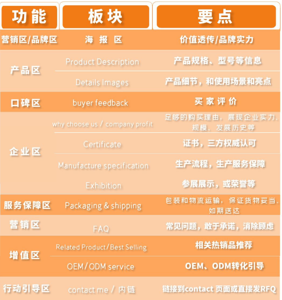以上板塊不是絕對(duì)的要求,大家可以根據(jù)企業(yè)情況、產(chǎn)品情況、營銷節(jié)點(diǎn)等,進(jìn)行調(diào)整,以便獲取到更高的詢盤轉(zhuǎn)化率。