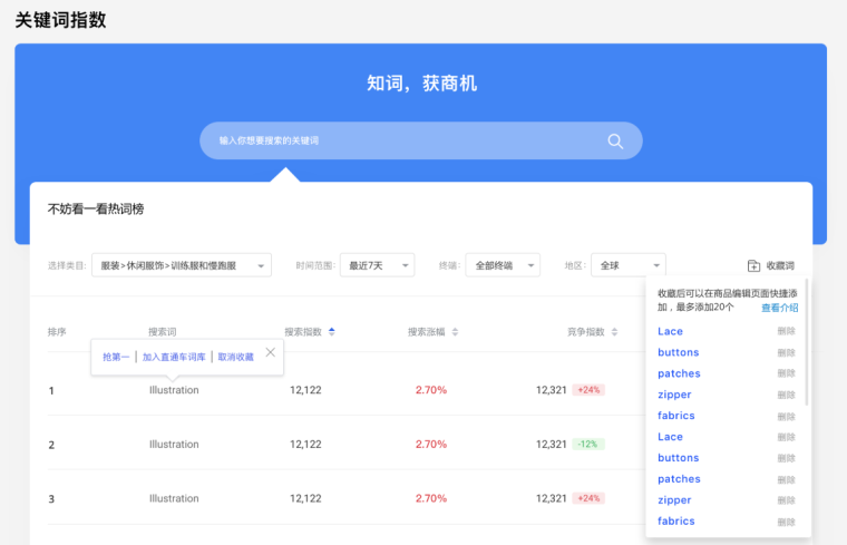 關(guān)鍵詞指數(shù)即將新增「收藏詞」功能,可在關(guān)鍵詞指數(shù)頁(yè)面,隨手添加收藏,收藏詞將同步至商品發(fā)布頁(yè)面用于產(chǎn)品發(fā)布。(預(yù)計(jì)11月上線)