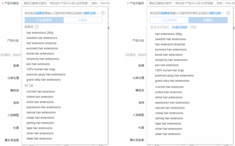 第二步:產(chǎn)品發(fā)布或編輯時(shí),選擇關(guān)鍵詞,下拉出現(xiàn)收藏詞表