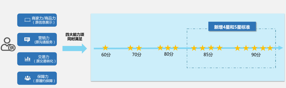 豐富指標體系,強調(diào)買家核心關(guān)注點,四大能力項一次升級為:商家力/商品力、營銷力、交易力、保障力;②.細化分層標準,凸顯更多優(yōu)質(zhì)商家,在3星之上孵化出4、5星。1-5星四大能力項分數(shù)要求分別是60-70-80-85-90.(可見圖)