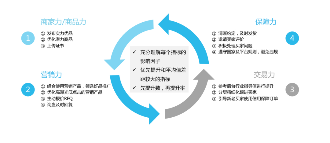 針對先易后難,在商家力/商品力和保障力是基礎(chǔ),也是相對容易的提分項,如這兩項沒有達到60分,應(yīng)首先進行優(yōu)化提升。營銷力是商家多場景觸達買家的能力體現(xiàn),需要商家不斷地花費心思進行優(yōu)化,并通過時間沉淀展現(xiàn)。交易力是最終效果的直接體現(xiàn),繩鋸木斷、水滴石穿,只有在平臺上不斷地耕耘,才會有巨大的收獲。