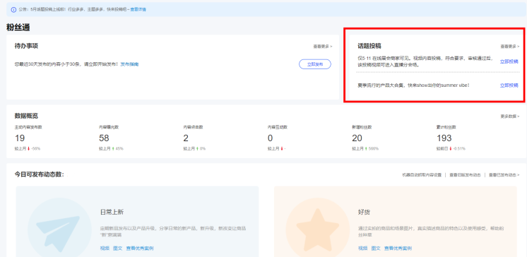 入口一:粉絲通頁面右上角有當(dāng)期話題的前兩條可以快速進入投稿,點擊“查看更多”能看到更多話題。