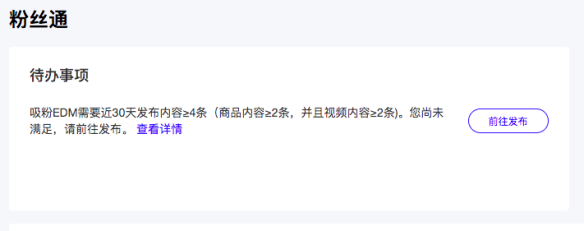 1)近30天內(nèi)(由于數(shù)據(jù)統(tǒng)計滯后,近2天的不算)是否有4條手動發(fā)布內(nèi)容(至少2條視頻內(nèi)容和2條商品內(nèi)容),支撐一個吸粉EDM,如果沒有,指導(dǎo)商家去發(fā)布內(nèi)容。  (新發(fā)的內(nèi)容,要2天后才能同步識別)
