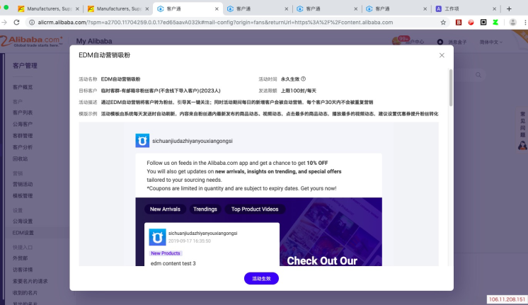 2.滿足條件的商家,會直接跳轉(zhuǎn)到客戶通界面,如果已經(jīng)配置好EDM門檻,則預(yù)覽吸粉EDM界面,點擊按鈕“活動生效”即開始自動觸發(fā)郵件。每日額度100封,每日自動續(xù)發(fā),活動取消后續(xù)發(fā)停止。如果沒有配置好EDM門檻,則引導(dǎo)去配置EDM門檻。