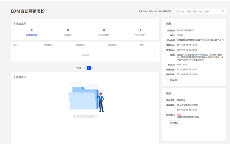 注意:若“活動生效”按鈕為灰,請檢查“待辦事項”是否有未完成的內(nèi)容,若待辦事項無內(nèi)容,則表示此活動已經(jīng)被開啟,無需再次操作生效??汕巴蛻艄芾?gt;營銷活動>找到活動“EDM自動營銷吸粉”>查看效果  進(jìn)行查看。