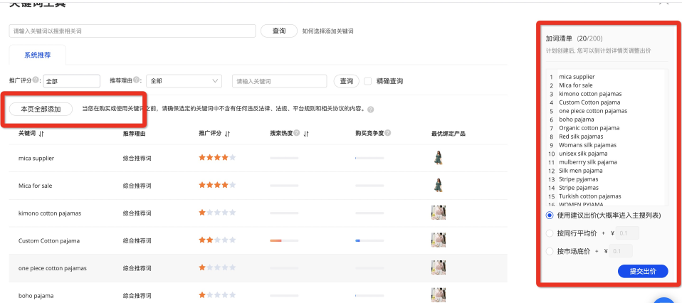 可選擇本頁(yè)全部關(guān)鍵詞,完成批量出價(jià)