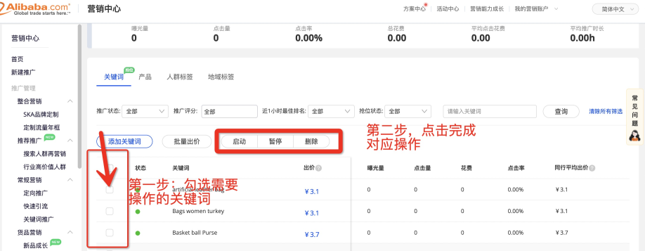 點(diǎn)擊計(jì)劃名稱,進(jìn)入計(jì)劃詳情后,點(diǎn)擊【關(guān)鍵詞】,即可看到您之前在關(guān)鍵詞推廣計(jì)劃中的全部關(guān)鍵詞;您可以在該界面完成關(guān)鍵詞的管理,不支持單個(gè)關(guān)鍵詞與產(chǎn)品的綁定與關(guān)聯(lián);