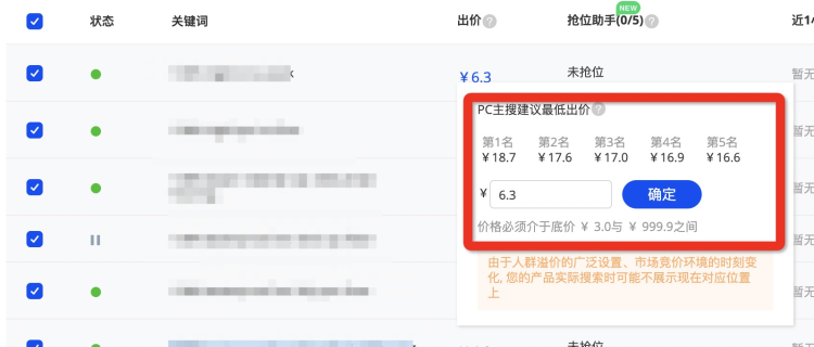 會(huì)根據(jù)關(guān)鍵詞當(dāng)前的競(jìng)爭(zhēng)數(shù)據(jù),給到您進(jìn)入PC主搜的建議價(jià)格,您在當(dāng)前界面設(shè)置完畢價(jià)格后,點(diǎn)擊確定即可;