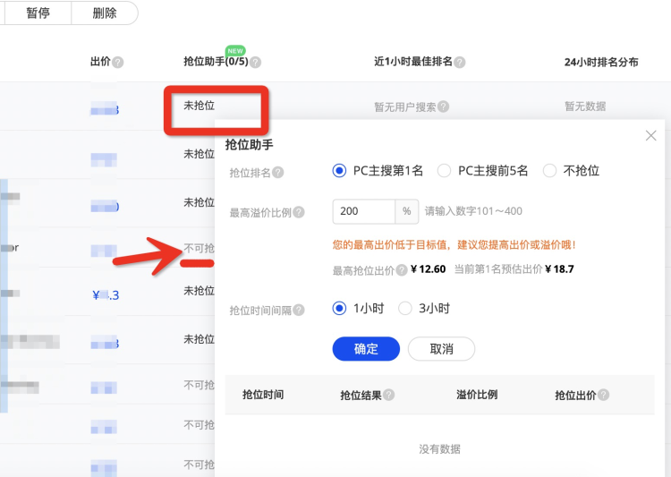如您的關(guān)鍵詞推廣評(píng)分在3星以上,即可設(shè)置搶位,反之不可搶位;