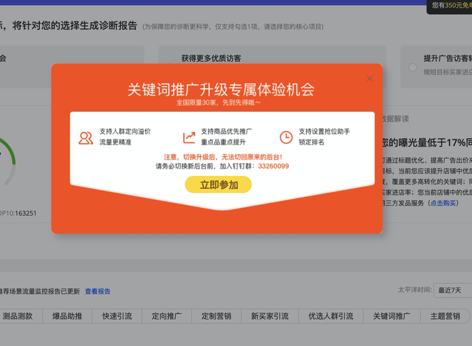 目前僅針對(duì)當(dāng)前推廣中的關(guān)鍵詞數(shù)量較少的商家開放內(nèi)測(cè),如您未收到邀請(qǐng),請(qǐng)您靜靜等待,預(yù)計(jì)2月底將逐步開放;