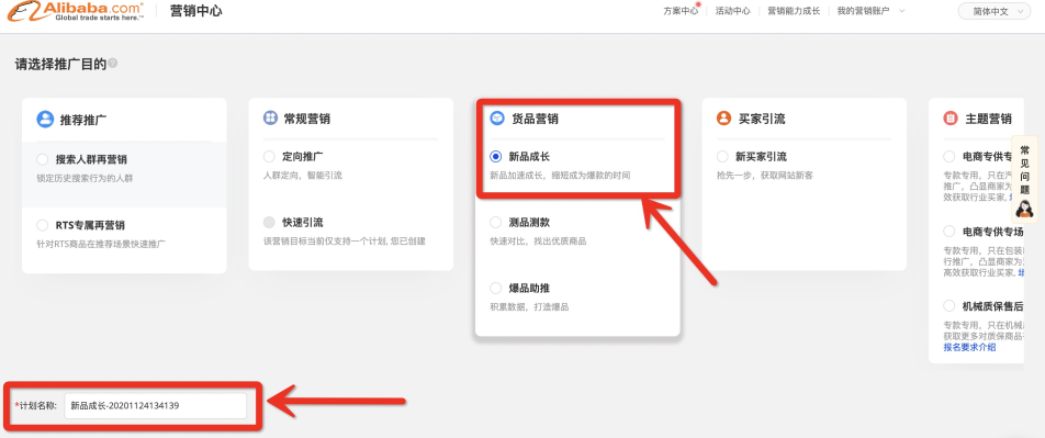 您可以通過(guò)首頁(yè)營(yíng)銷中心【新品成長(zhǎng)】,或者【方案中心】,以及直接【新建計(jì)劃】,來(lái)新建【新品成長(zhǎng)】的計(jì)劃
