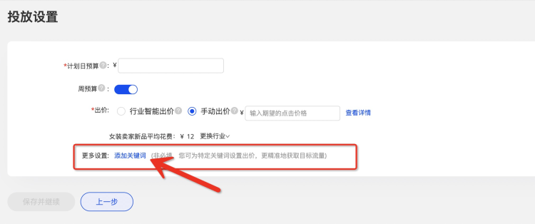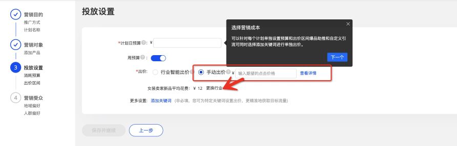 第三步:設(shè)置預(yù)算與出價(jià),出價(jià)要科學(xué),過(guò)低會(huì)影響商品流量的獲??;