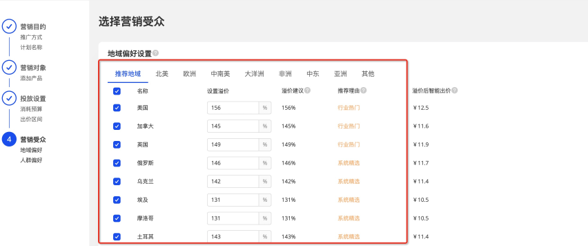 國(guó)家選擇思路1:您可以根據(jù)計(jì)劃中產(chǎn)品的主打國(guó)家,進(jìn)行目標(biāo)國(guó)家的溢價(jià)設(shè)置;溢價(jià)率*計(jì)劃出價(jià)得出的價(jià)格越高,您在該國(guó)家的競(jìng)爭(zhēng)率就越高;