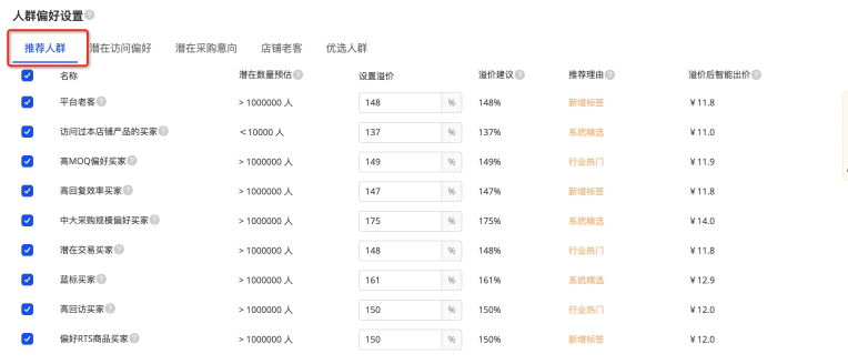 您也可以根據(jù)您的人群偏好來(lái)選擇合適的人群,建議直接在系統(tǒng)為您推薦的人群當(dāng)中進(jìn)行選擇哦~