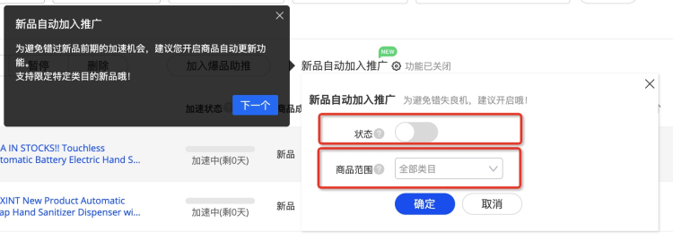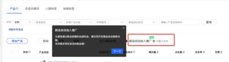 您可以勾選【新品自動(dòng)加入推廣】,來(lái)實(shí)現(xiàn)自動(dòng)更新,開(kāi)啟該功能后,預(yù)計(jì)商品將在您發(fā)布且上架后,次日自動(dòng)選入,加入您的新品計(jì)劃中進(jìn)行推廣~
