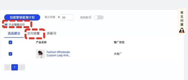 - 定向錦囊:根據(jù)您選擇推廣的品中,推薦藍(lán)海指數(shù)最高的5個(gè)國(guó)家進(jìn)行推廣,自動(dòng)設(shè)置溢價(jià)。即可開(kāi)啟您的營(yíng)銷(xiāo)藍(lán)海榜計(jì)劃。