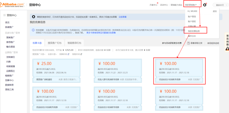 A: 營銷中心—>右上角“我的營銷賬戶”—>“我的優(yōu)惠信息“—>“優(yōu)惠卡券”