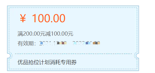 報(bào)名成功就可以獲得2張滿200減100元的卡券,卡券僅限在優(yōu)品搶位計(jì)劃中使用。