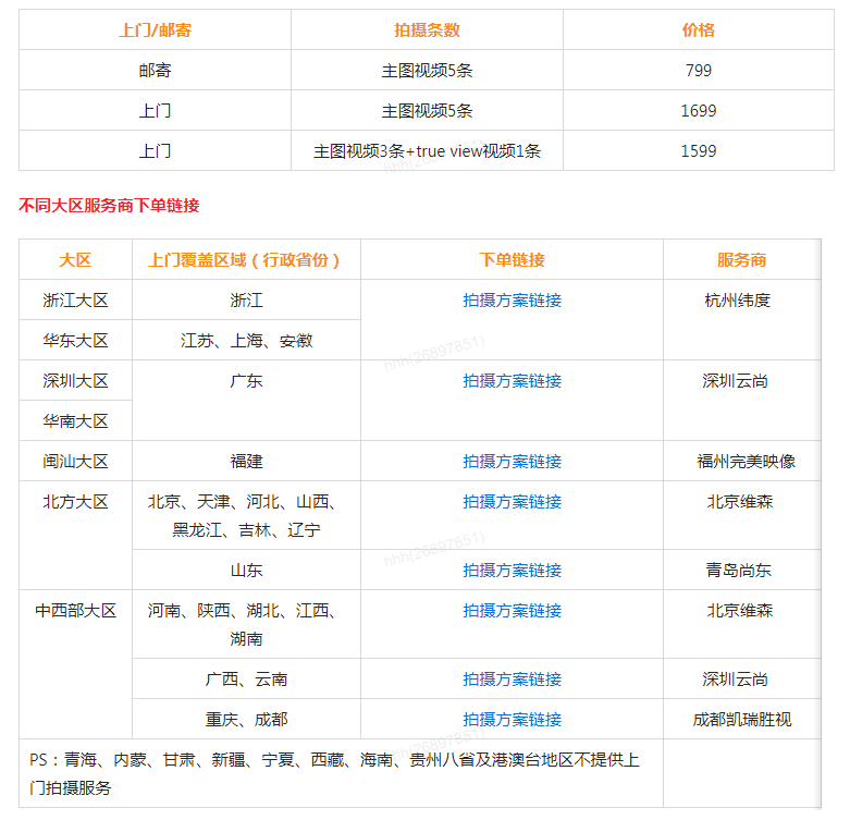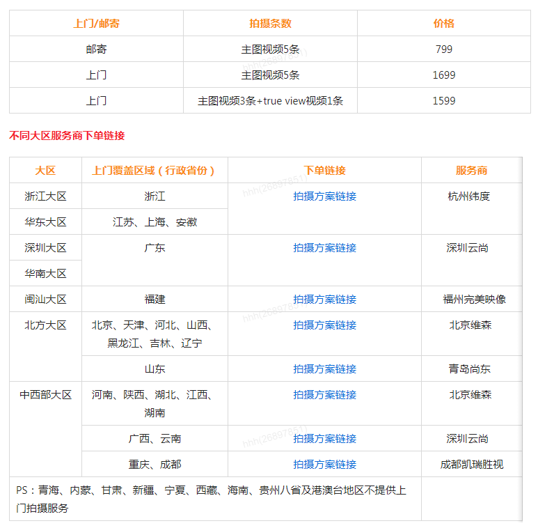 如果店鋪無優(yōu)質(zhì)視頻:建議購買三方拍攝,外貿(mào)服務(wù)市場針對本次活動給出專屬拍攝優(yōu)惠,協(xié)助發(fā)布優(yōu)質(zhì)視頻,服務(wù)商拍攝優(yōu)先審核,具體方案如下,各大區(qū)商家可以根據(jù)指定服務(wù)商進(jìn)行下單