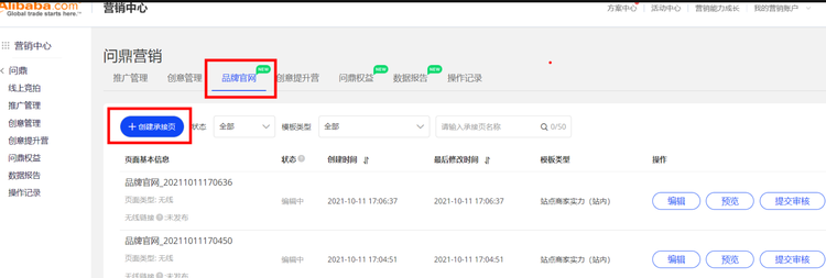 “營(yíng)銷(xiāo)中心-問(wèn)鼎后臺(tái)-品牌官網(wǎng)”點(diǎn)擊創(chuàng)建承接頁(yè),點(diǎn)擊推品模板“開(kāi)始制作”