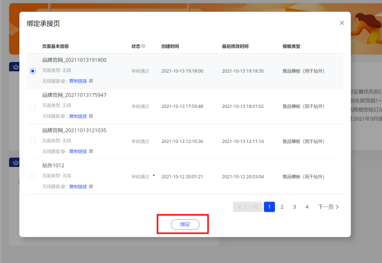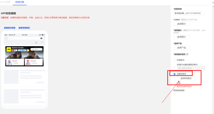 當(dāng)制作的頁(yè)面審核通過(guò)后,就可以開(kāi)始綁定創(chuàng)意投放了,在新建移動(dòng)創(chuàng)意時(shí),背景圖承接頁(yè)一項(xiàng),選擇“品牌承接頁(yè)”,在彈窗中選擇審核通過(guò)的,點(diǎn)擊確定即可