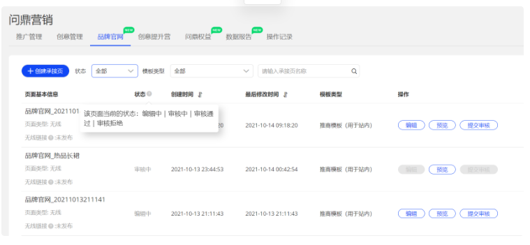 - 提交審核后,系統(tǒng)自動(dòng)跳轉(zhuǎn)到品牌官網(wǎng)的list頁(yè)面,這里面你可以查看制作官網(wǎng)目前的狀態(tài)。