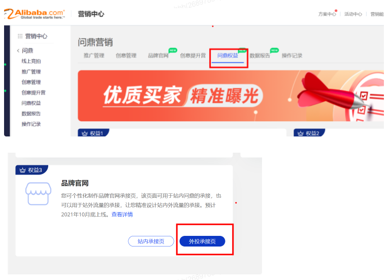 當(dāng)制作的頁(yè)面審核通過(guò)后,就可以開(kāi)始綁定創(chuàng)意投放了,在問(wèn)鼎后臺(tái)-問(wèn)鼎權(quán)益-品牌官網(wǎng)權(quán)益中,點(diǎn)擊“外投承接頁(yè)”,勾選綁定審核通過(guò)的頁(yè)面即可