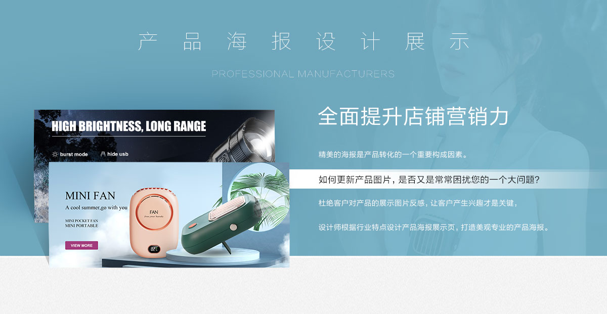 設(shè)計師根據(jù)行業(yè)特點設(shè)計海報等展示內(nèi)容,體現(xiàn)賣家的專業(yè)性,提升訪客的體驗感