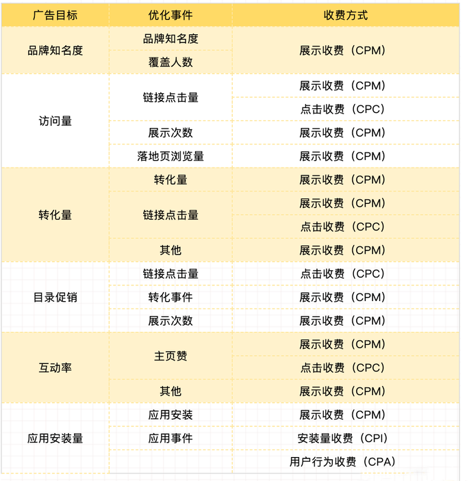 但是這些收費(fèi)方式不是可以隨意進(jìn)行選擇的,不同的廣告目標(biāo)對(duì)應(yīng)的有不同的收費(fèi)方式,具體可參見下圖: